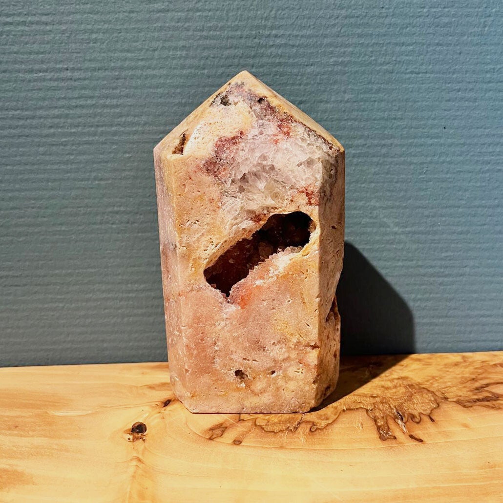 De torenvorm versterkt en richt de energie, waardoor deze steen ideaal is voor een rustige plek in huis of op je werkplek. De warme, natuurlijke tinten geven een serene en krachtige uitstraling.
